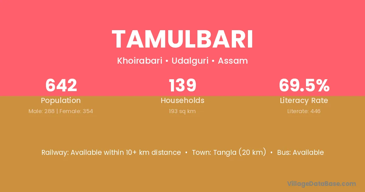 Tamulbari village has a total population of 642 people, of which 288 are males and 354 are females.