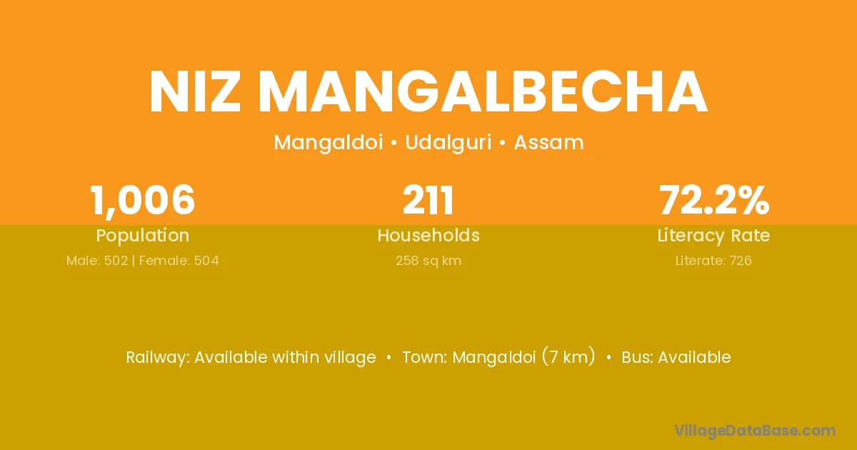 Mangaldoi (7 km) is the nearest town to Niz Mangalbecha village for major economic activities and is located approximately 7 km away.
