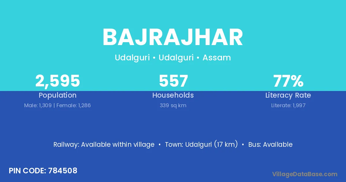 Orang (7 km) is the nearest town to Bajrajhar village for major economic activities and is located approximately 7 km away.