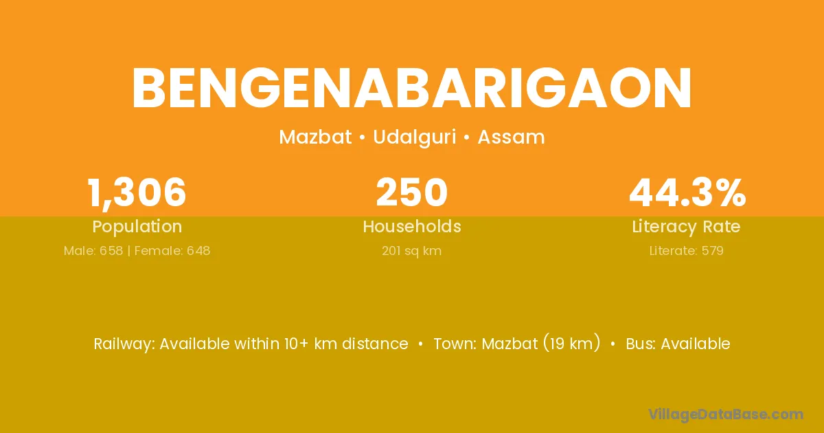 Bengenabarigaon village has a total population of 1,306 people, of which 658 are males and 648 are females.