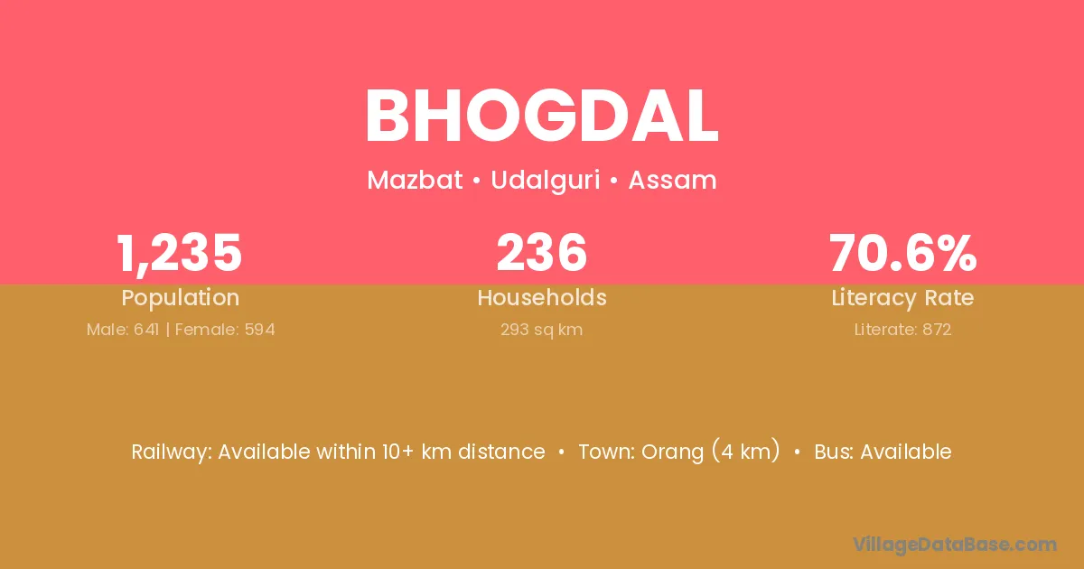 Orang (4 km) is the nearest town to Bhogdal village for major economic activities and is located approximately 4 km away.