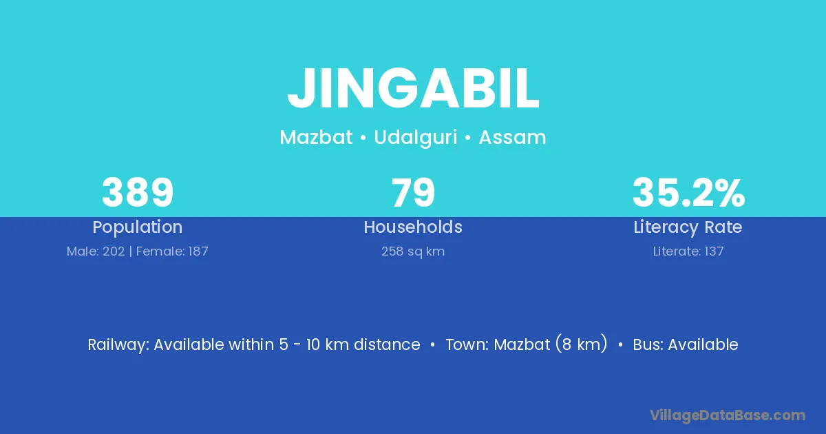 Jingabil village has a total population of 389 people, of which 202 are males and 187 are females.