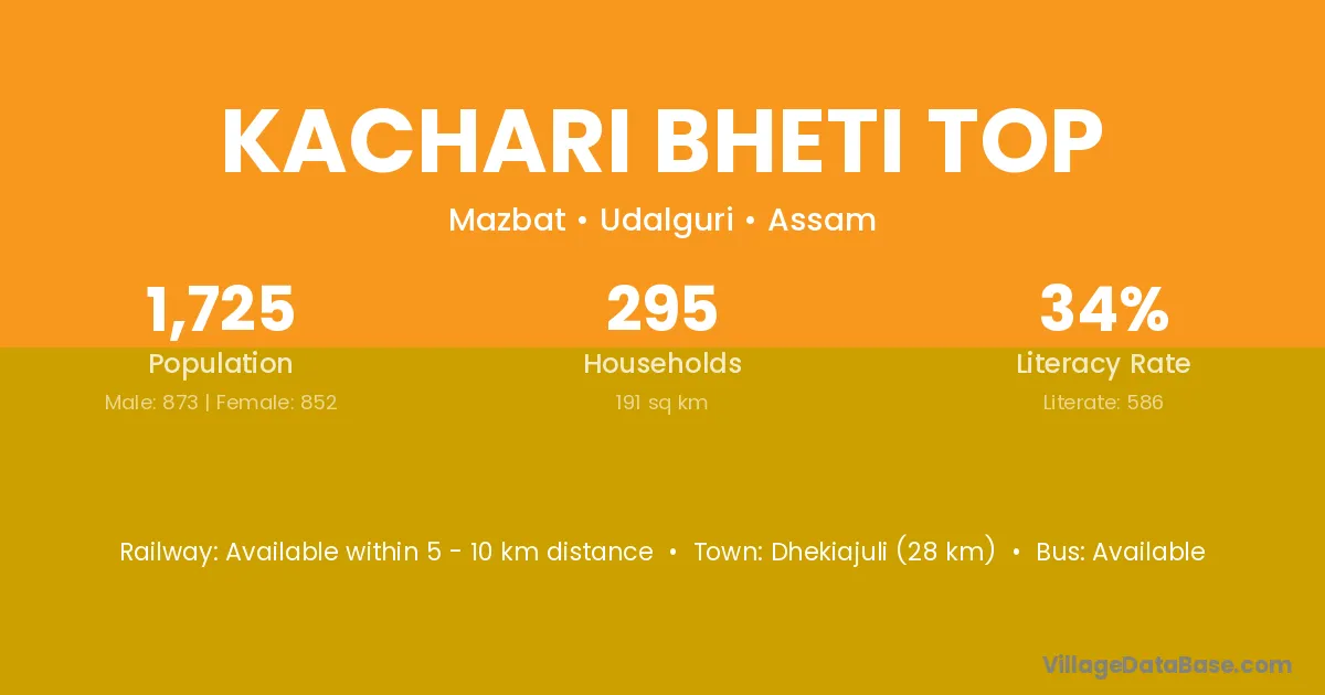 Dhekiajuli (28 km) is the nearest town to Kachari Bheti Top village for major economic activities and is located approximately 28 km away.
