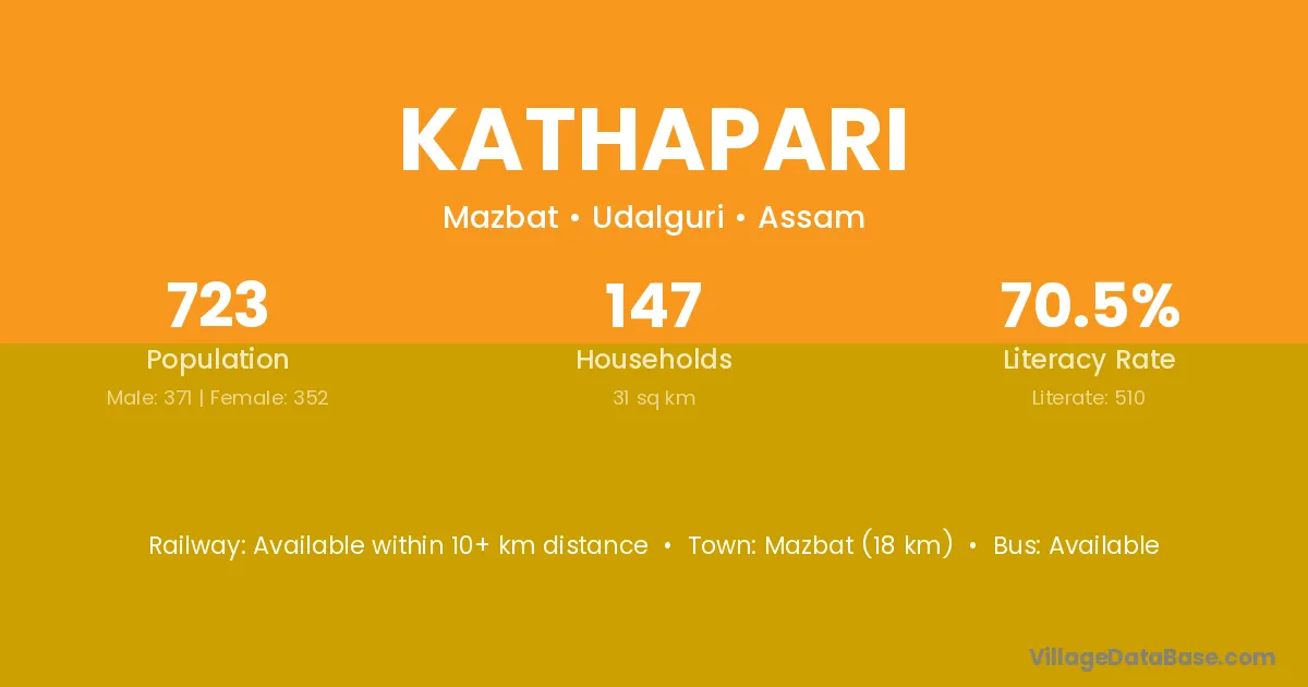 Mazbat (18 km) is the nearest town to Kathapari village for major economic activities and is located approximately 18 km away.