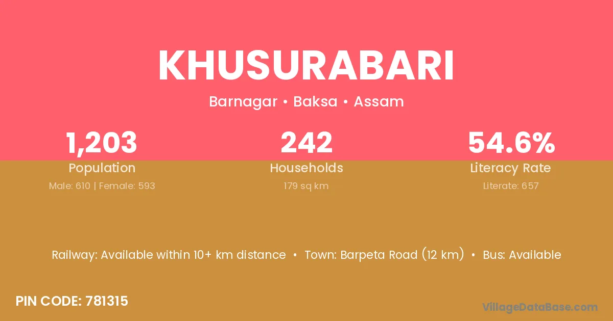 Khusurabari village has a total population of 1,241 people, of which 625 are males and 616 are females.