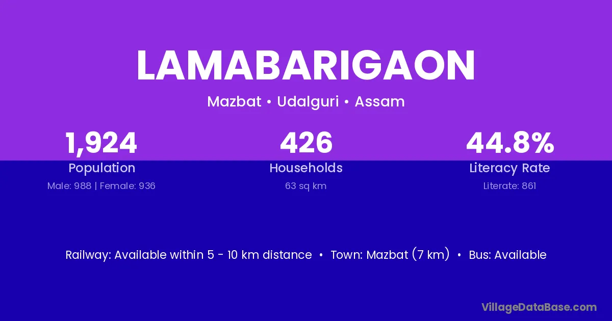Mazbat (7 km) is the nearest town to Lamabarigaon village for major economic activities and is located approximately 7 km away.