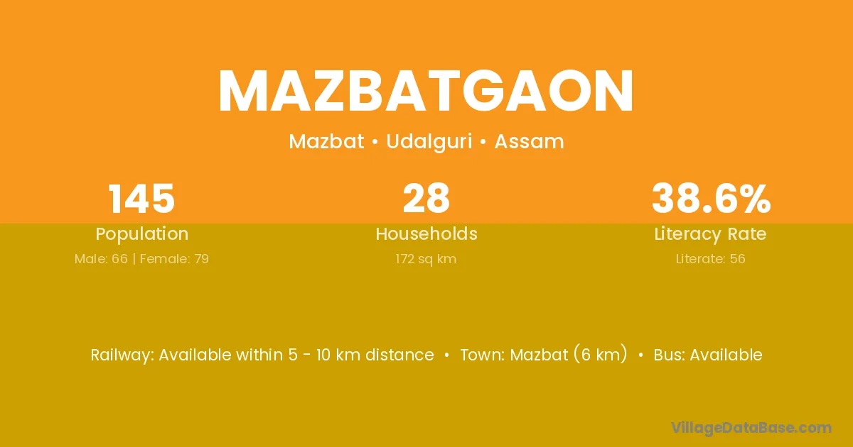 Mazbatgaon village has a total population of 145 people, of which 66 are males and 79 are females.