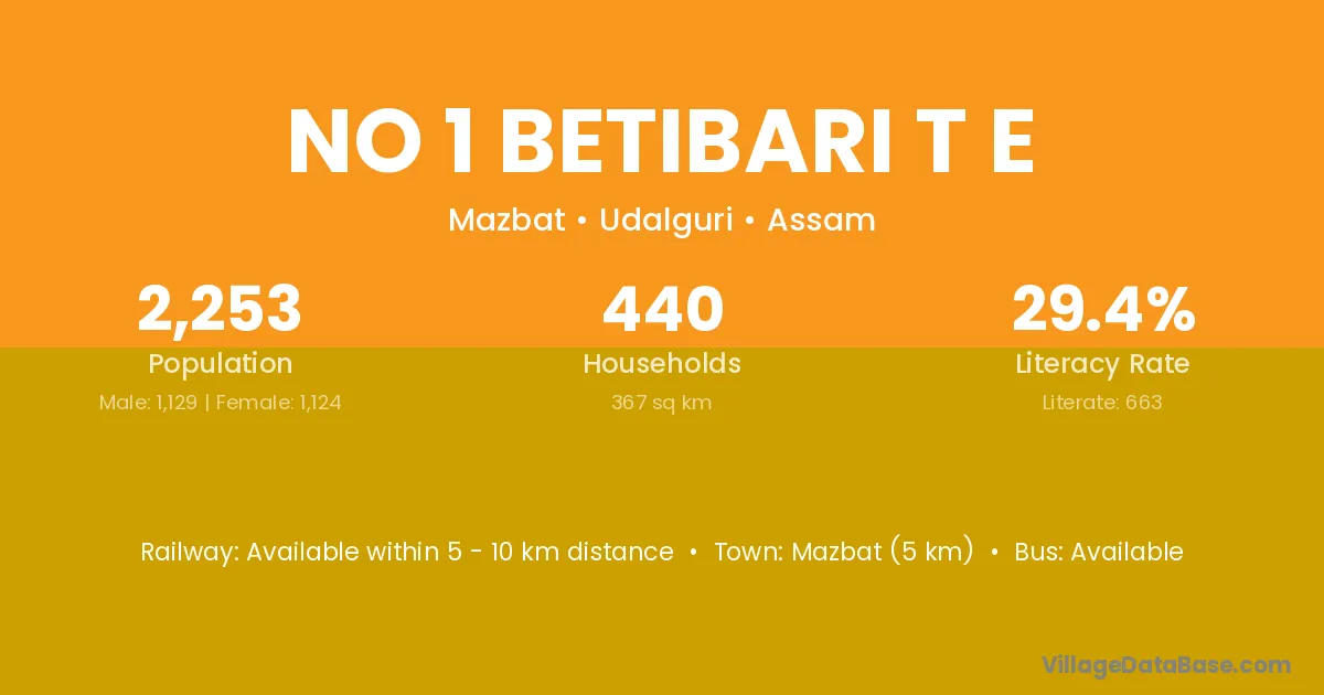 Mazbat (5 km) is the nearest town to No 1 Betibari T E village for major economic activities and is located approximately 5 km away.