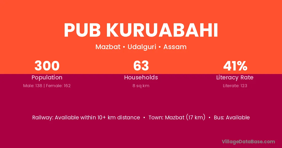 Pub Kuruabahi village has a total population of 300 people, of which 138 are males and 162 are females.
