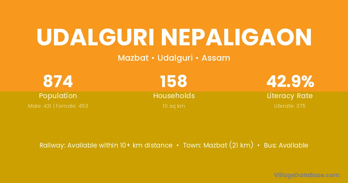 Udalguri Nepaligaon village has a total population of 874 people, of which 421 are males and 453 are females.