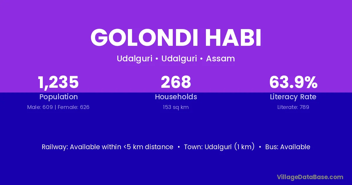 Udalguri (1 km) is the nearest town to Golondi Habi village for major economic activities and is located approximately 1 km away.