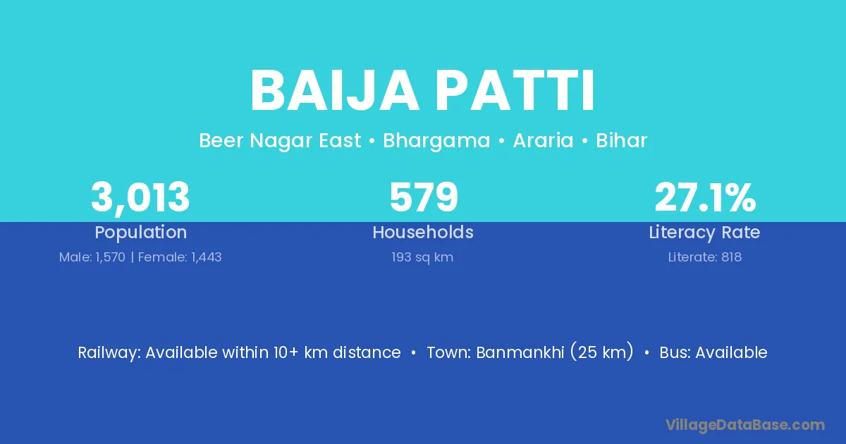 Banmankhi (25 km) is the nearest town to Baija Patti village for major economic activities and is located approximately 25 km away.
