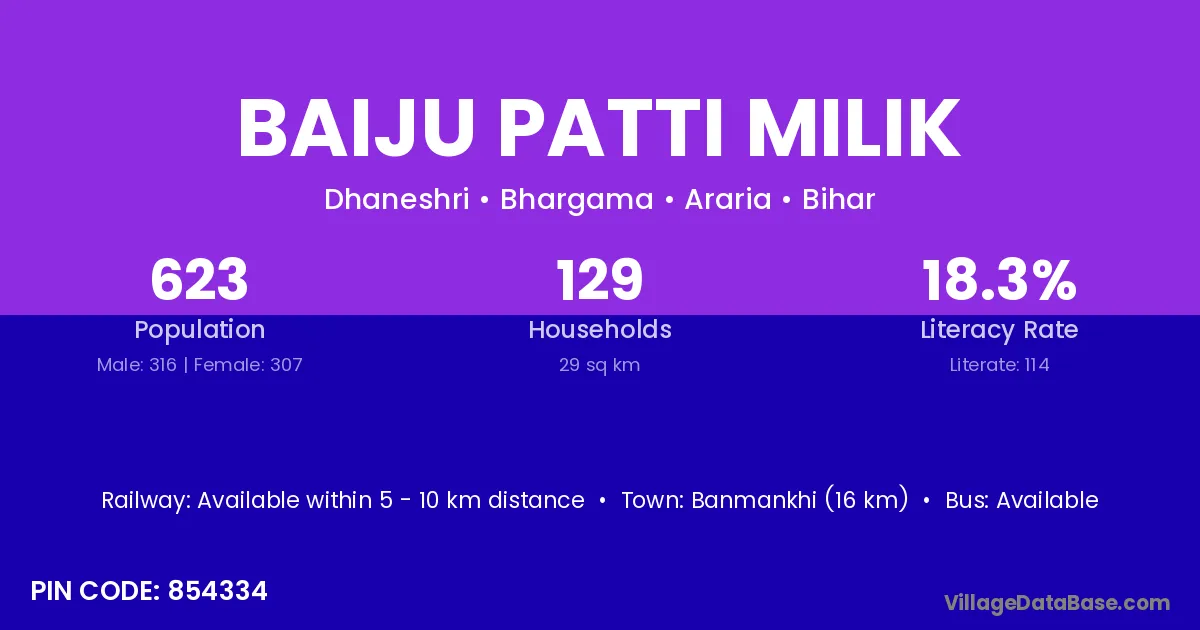 Banmankhi (16 km) is the nearest town to Baiju Patti Milik village for major economic activities and is located approximately 16 km away.