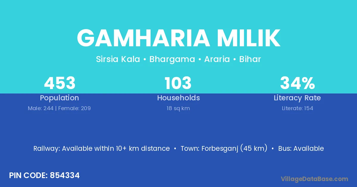 Forbesganj (45 km) is the nearest town to Gamharia Milik village for major economic activities and is located approximately 45 km away.