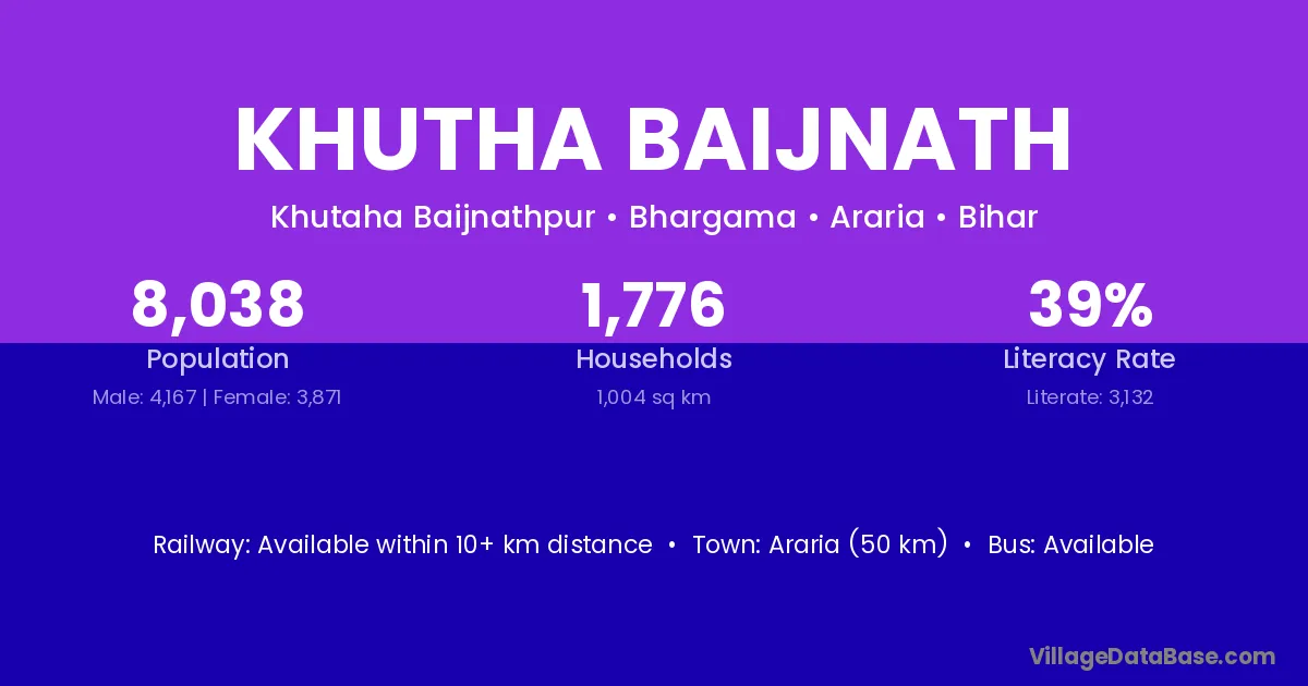 Araria (50 km) is the nearest town to Khutha Baijnath village for major economic activities and is located approximately 50 km away.