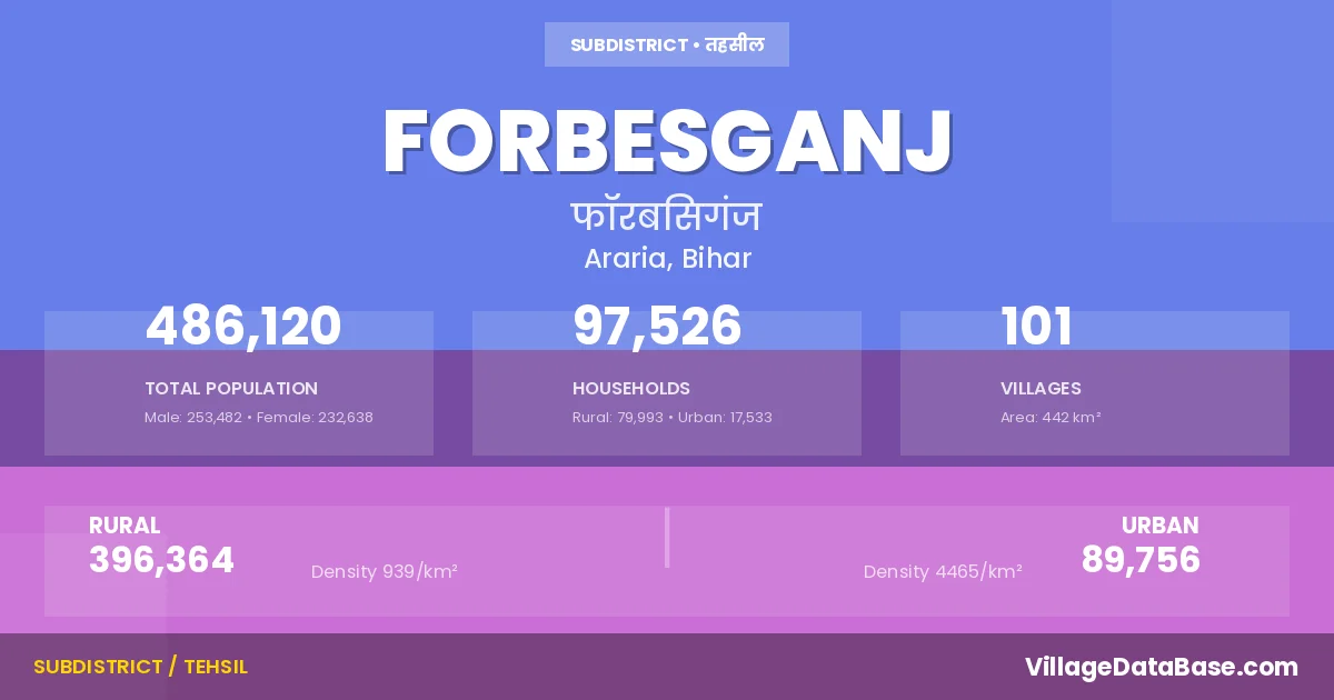 According to the 2011 census The total area of Forbesganj Subdivision is 442 km², with a population of 486120 people. The population density is 1,099 inhabitants per square kilometre, and there are approximately 97526 houses in the sub district.