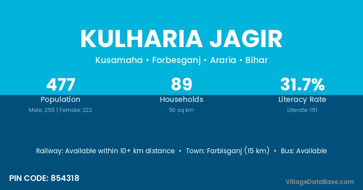 Farbisganj (15 km) is the nearest town to Kulharia Jagir village for major economic activities and is located approximately 15 km away.