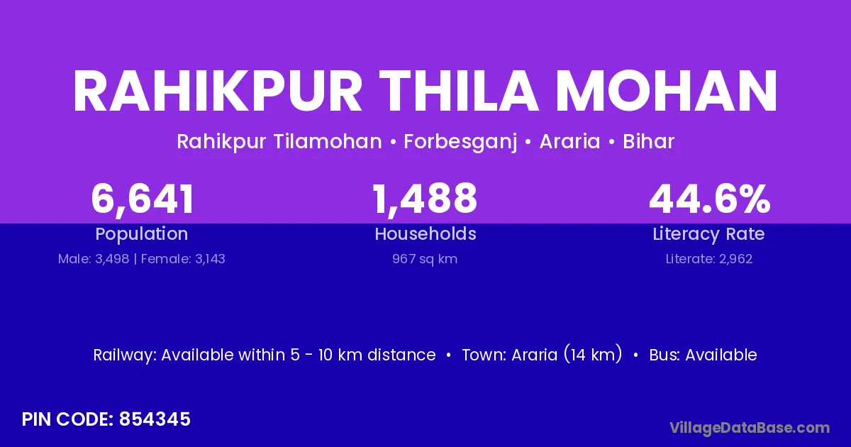 Araria (14 km) is the nearest town to Rahikpur Thila Mohan village for major economic activities and is located approximately 14 km away.
