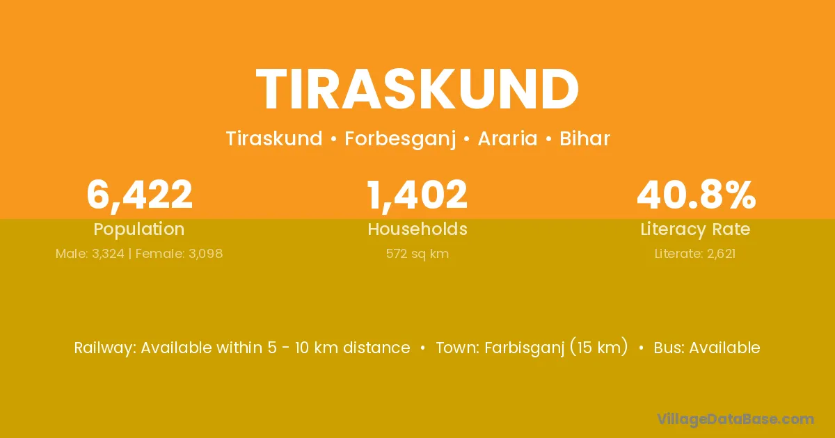 Farbisganj (15 km) is the nearest town to Tiraskund village for major economic activities and is located approximately 15 km away.