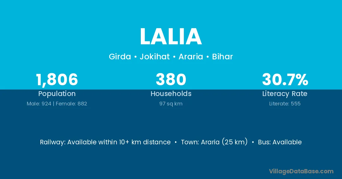 Araria (25 km) is the nearest town to Lalia village for major economic activities and is located approximately 25 km away.