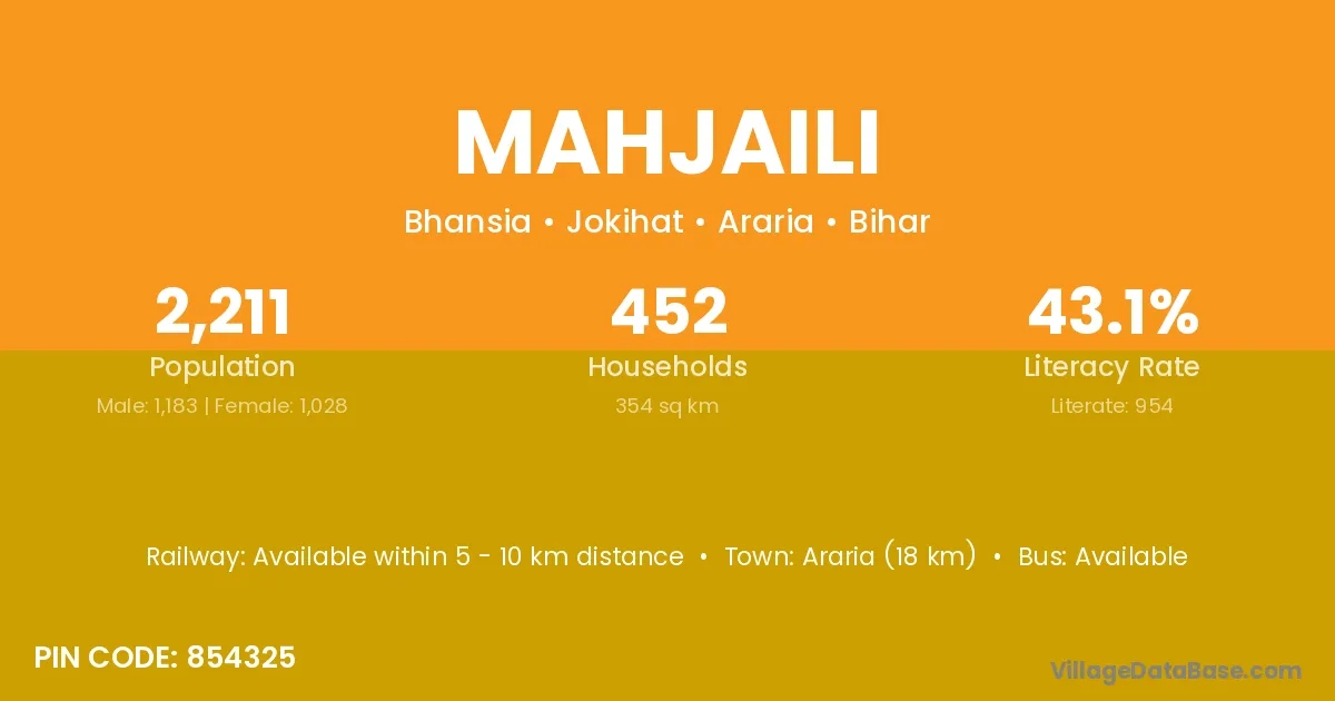 Araria (18 km) is the nearest town to Mahjaili village for major economic activities and is located approximately 18 km away.