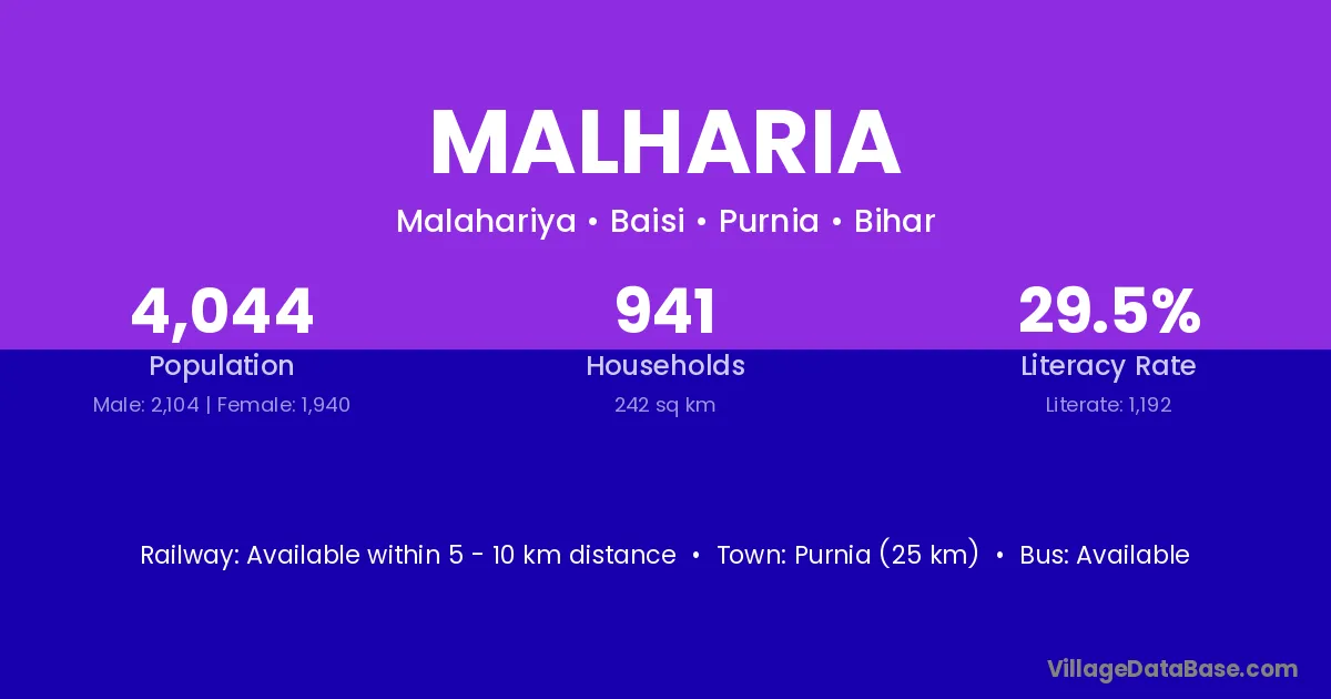 Araria (15 km) is the nearest town to Malharia village for major economic activities and is located approximately 15 km away.