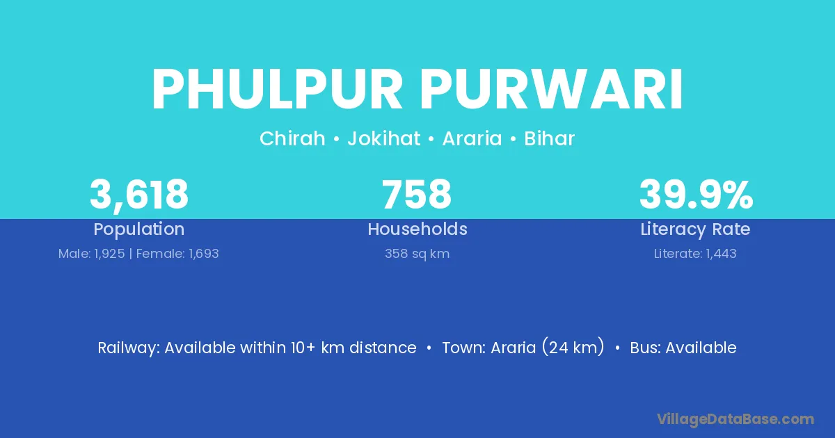 Araria (24 km) is the nearest town to Phulpur Purwari village for major economic activities and is located approximately 24 km away.