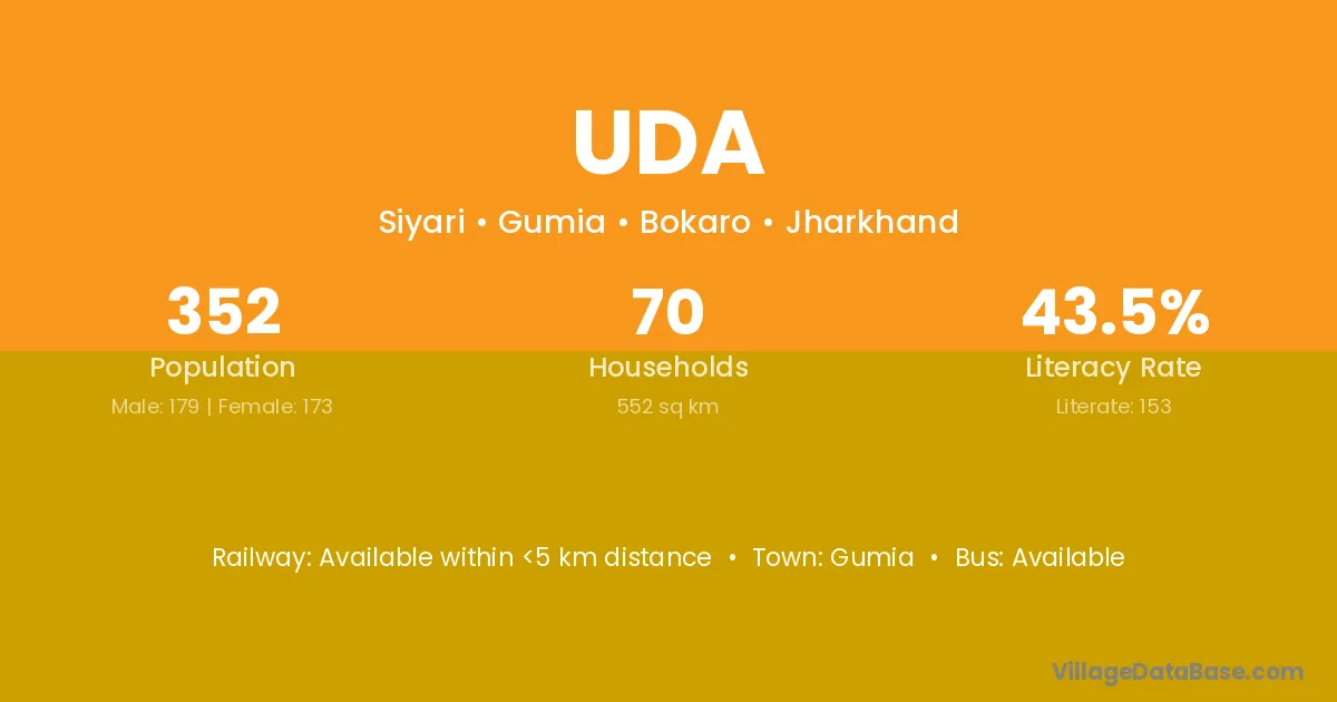 The literacy rate of Uda village is 39.77%. Male literacy stands at 44.60% and female literacy at 34.46%.
