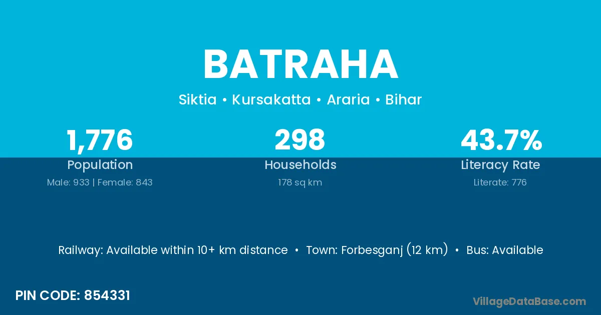 Forbesganj (12 km) is the nearest town to Batraha village for major economic activities and is located approximately 12 km away.