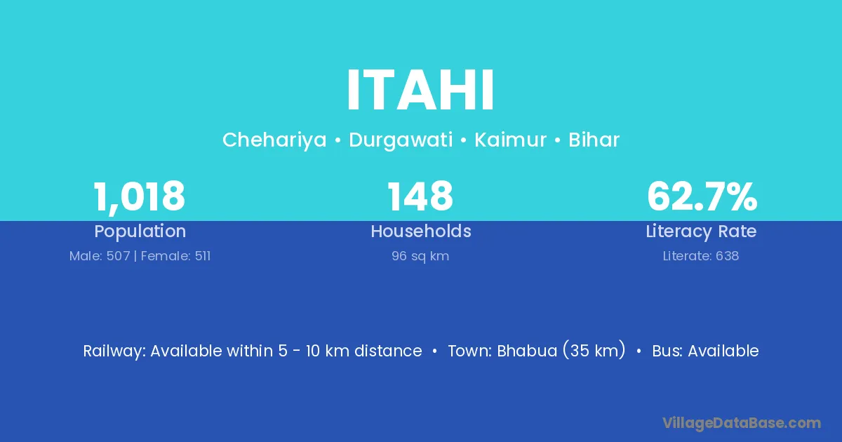 The literacy rate of Itahi village is 47.64%. Male literacy stands at 56.04% and female literacy at 38.86%.