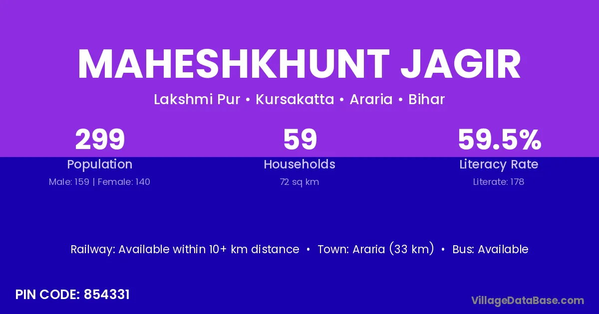 Araria (33 km) is the nearest town to Maheshkhunt Jagir village for major economic activities and is located approximately 33 km away.