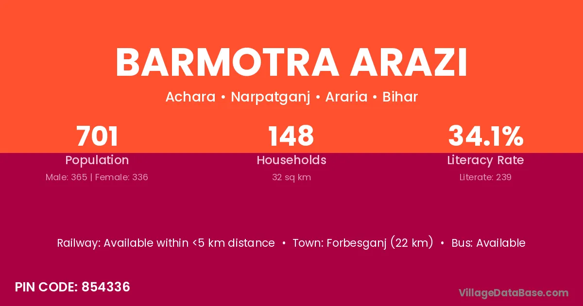 Forbesganj (22 km) is the nearest town to Barmotra Arazi village for major economic activities and is located approximately 22 km away.
