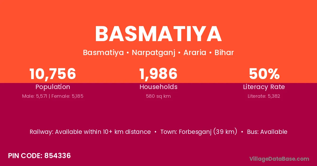 Forbesganj (39 km) is the nearest town to Basmatiya village for major economic activities and is located approximately 39 km away.