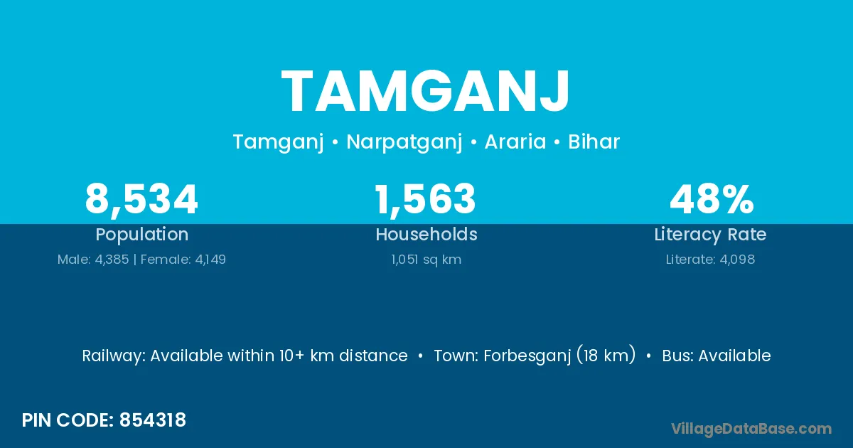 Forbesganj (18 km) is the nearest town to Tamganj village for major economic activities and is located approximately 18 km away.