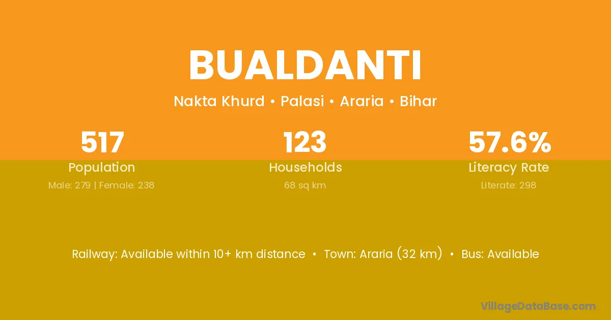 Araria (32 km) is the nearest town to Bualdanti village for major economic activities and is located approximately 32 km away.