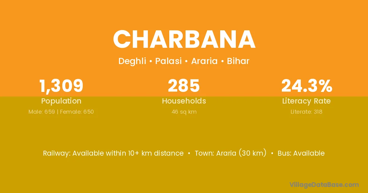 Araria (30 km) is the nearest town to Charbana village for major economic activities and is located approximately 30 km away.