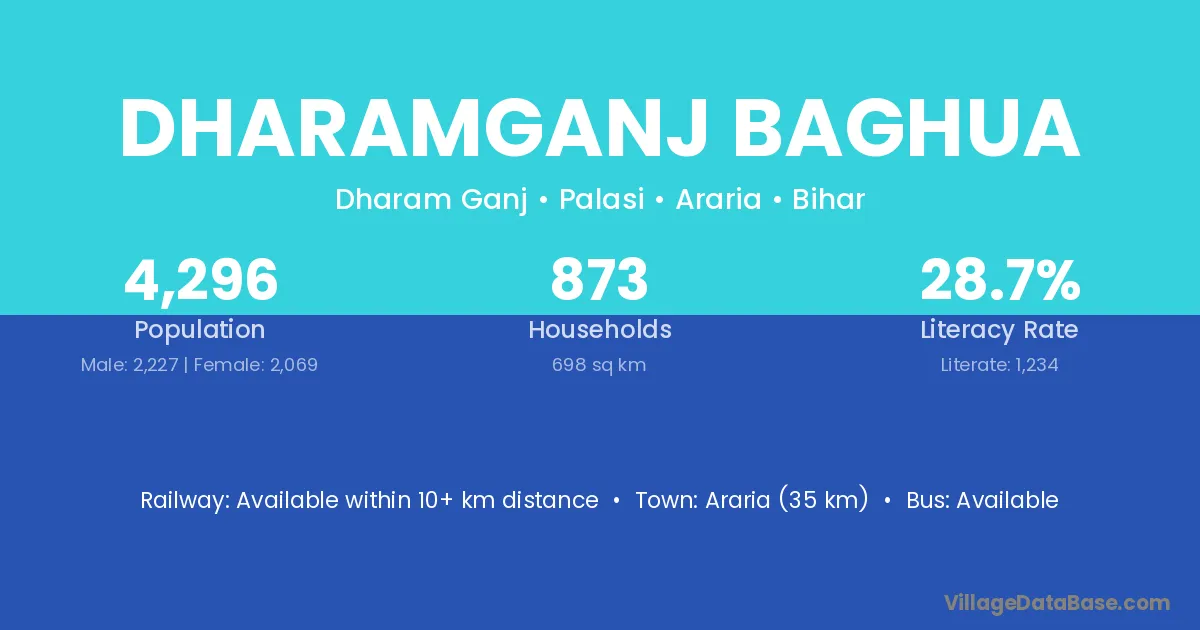 Araria (35 km) is the nearest town to Dharamganj Baghua village for major economic activities and is located approximately 35 km away.