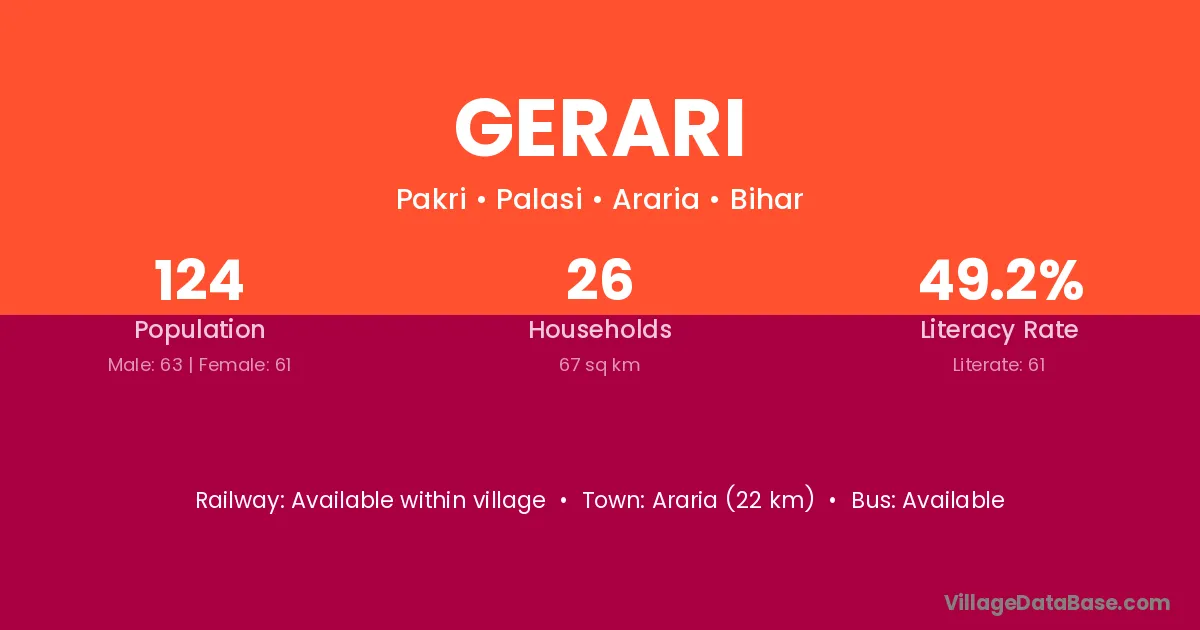 Araria (22 km) is the nearest town to Gerari village for major economic activities and is located approximately 22 km away.