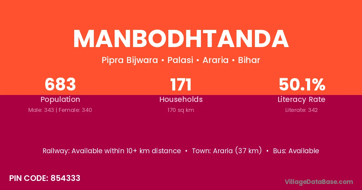 Araria (37 km) is the nearest town to Manbodhtanda village for major economic activities and is located approximately 37 km away.