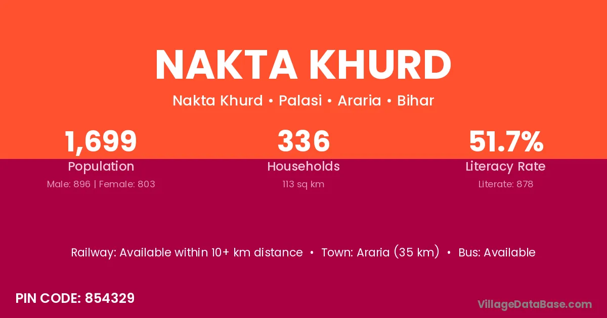 Nakta Khurd village has a total population of 1,699 people, of which 896 are males and 803 are females.