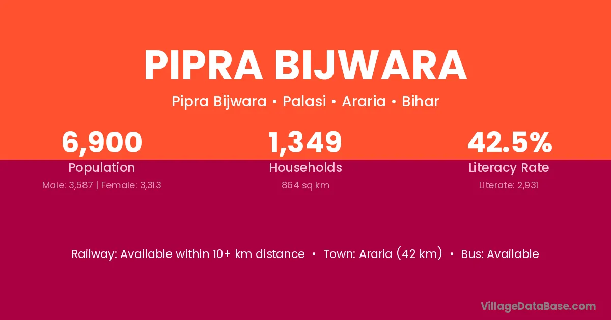 Araria (42 km) is the nearest town to Pipra Bijwara village for major economic activities and is located approximately 42 km away.