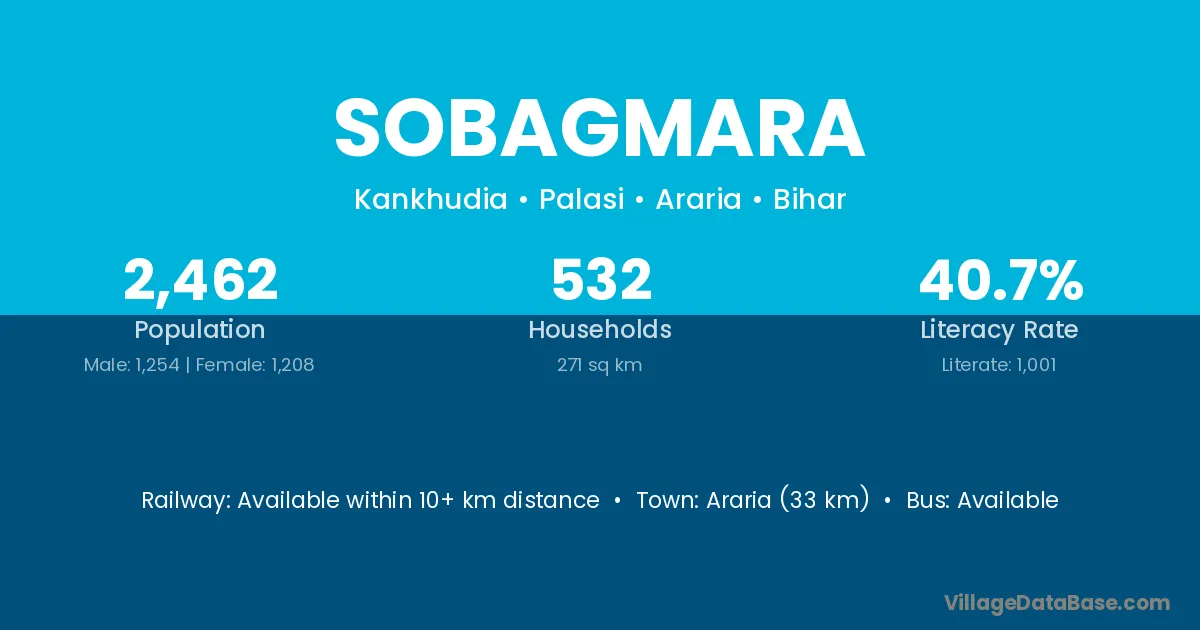 Araria (33 km) is the nearest town to Sobagmara village for major economic activities and is located approximately 33 km away.