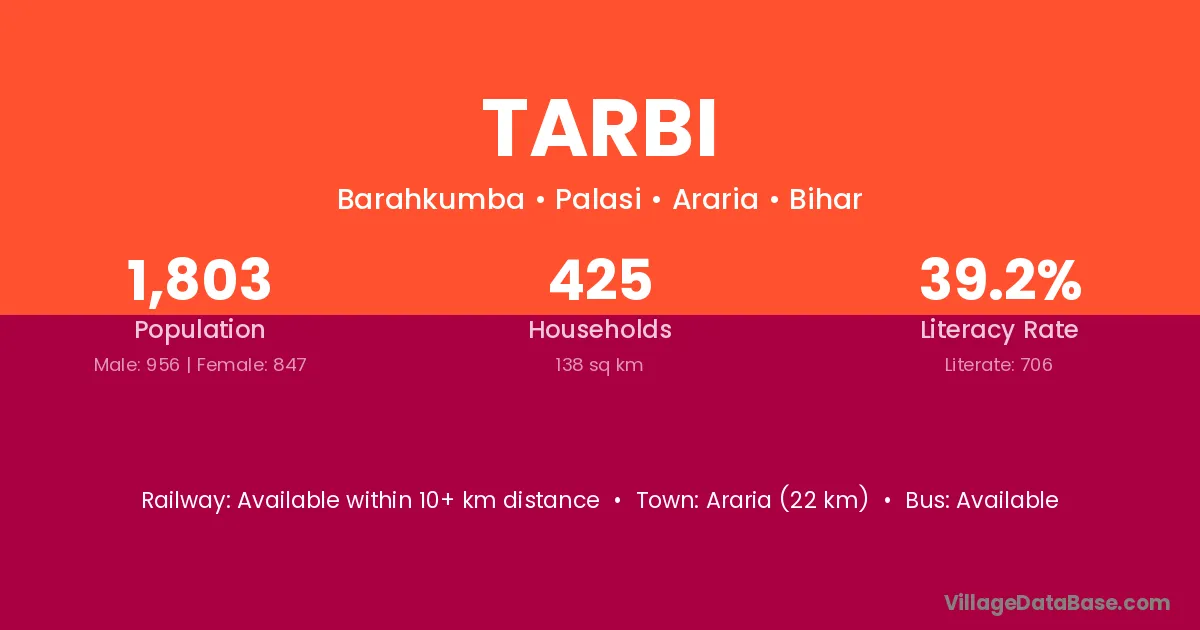 Araria (22 km) is the nearest town to Tarbi village for major economic activities and is located approximately 22 km away.