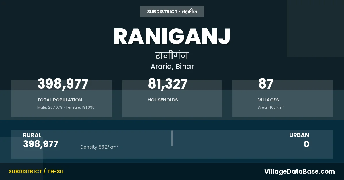 Raniganj is a town and Subdivision in the Araria district of the Bihar. In India, a Subdivision is a subdivision of a district responsible for the administration and revenue collection of a specific area within the district. Subdivisions play a crucial role in the local governance structure, contributing significantly to the development and administration of their communities.
