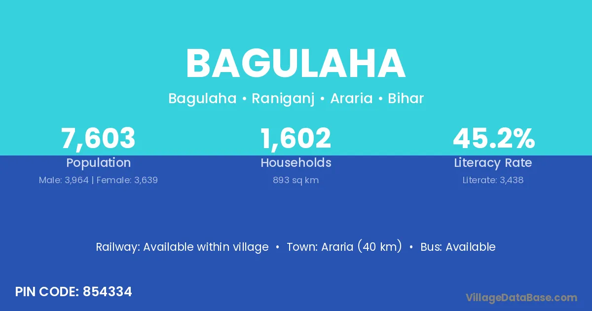 Araria (40 km) is the nearest town to Bagulaha village for major economic activities and is located approximately 40 km away.