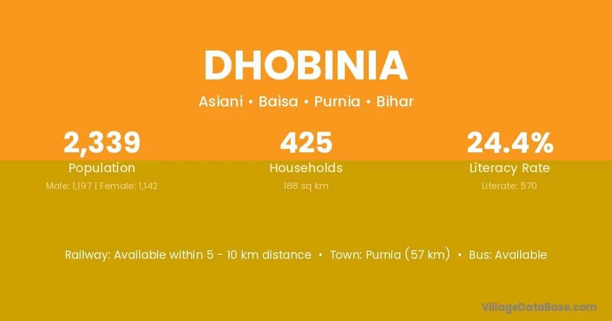 Araria (25 km) is the nearest town to Dhobinia village for major economic activities and is located approximately 25 km away.