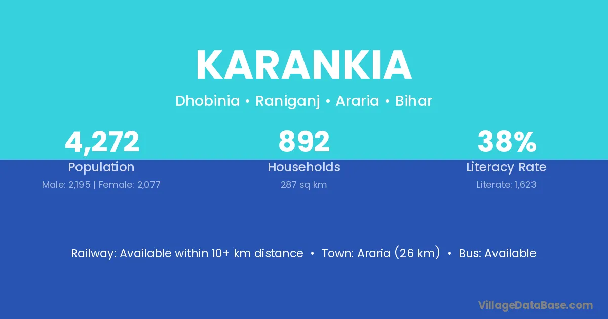 Araria (26 km) is the nearest town to Karankia village for major economic activities and is located approximately 26 km away.