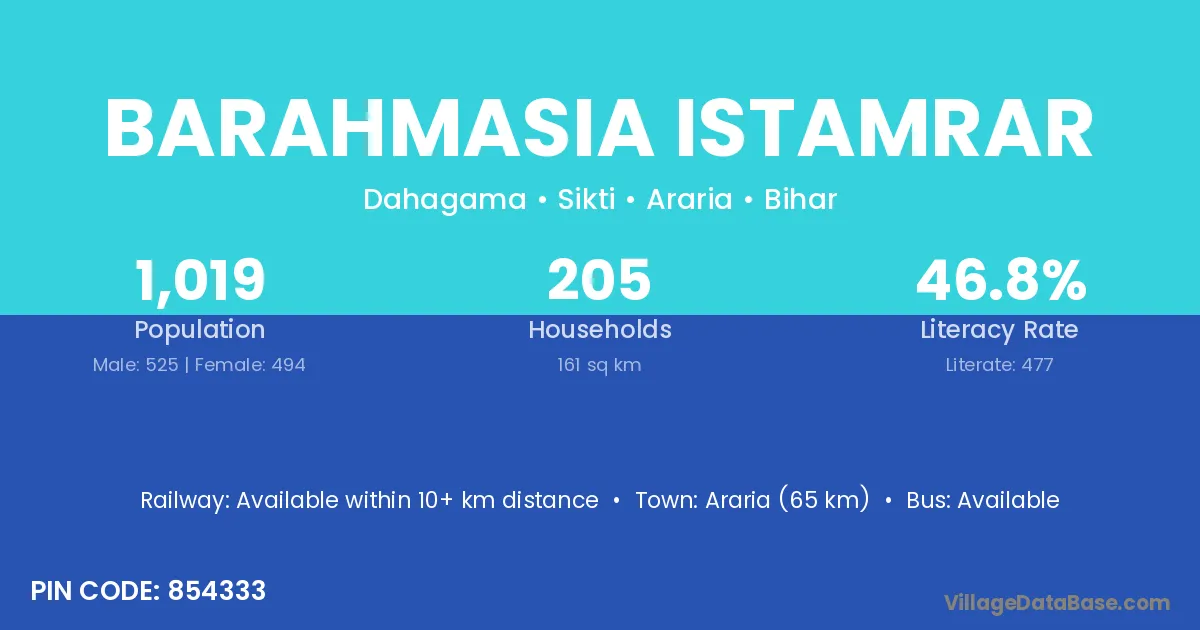 Barahmasia Istamrar village has a total population of 1,019 people, of which 525 are males and 494 are females.