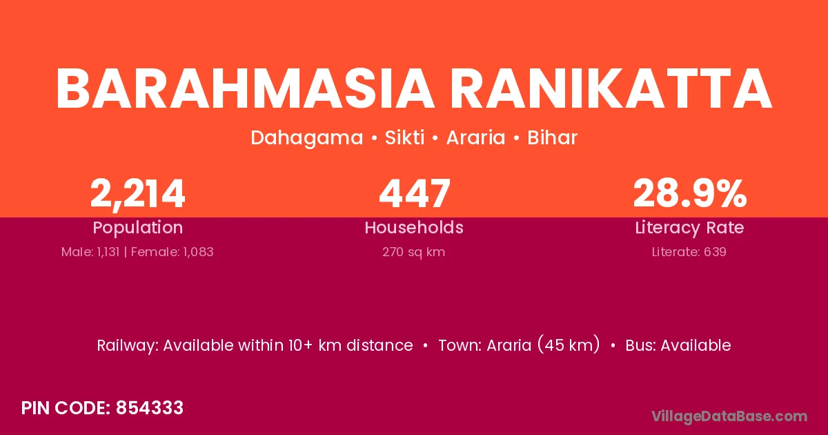 Araria (45 km) is the nearest town to Barahmasia Ranikatta village for major economic activities and is located approximately 45 km away.