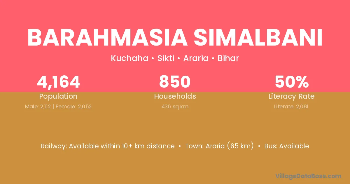 Araria (65 km) is the nearest town to Barahmasia Simalbani village for major economic activities and is located approximately 65 km away.